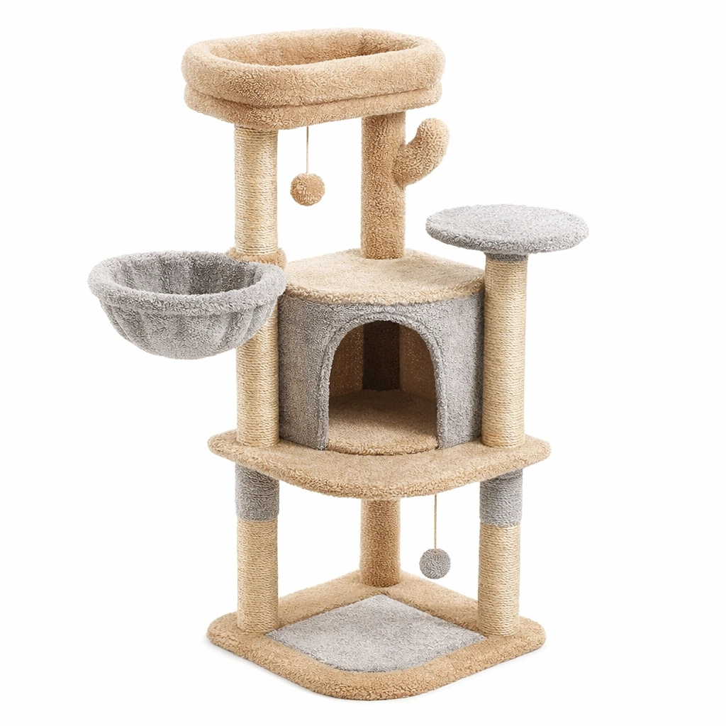 Este árbol rascador para gatos está diseñado con múltiples niveles para descansar, jugar y afilar sus garras. Fabricado con MDF, revestido con felpa de poliéster suave, y postes cubiertos de cuerda de sisal natural.