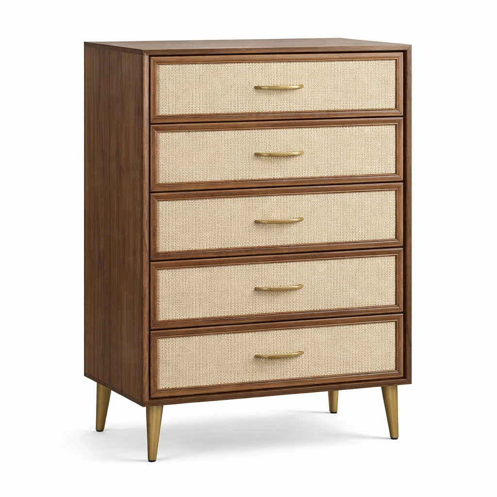 Material: Madera chapada en nogal, frente de cajones de ratán tejido, tiradores de metal